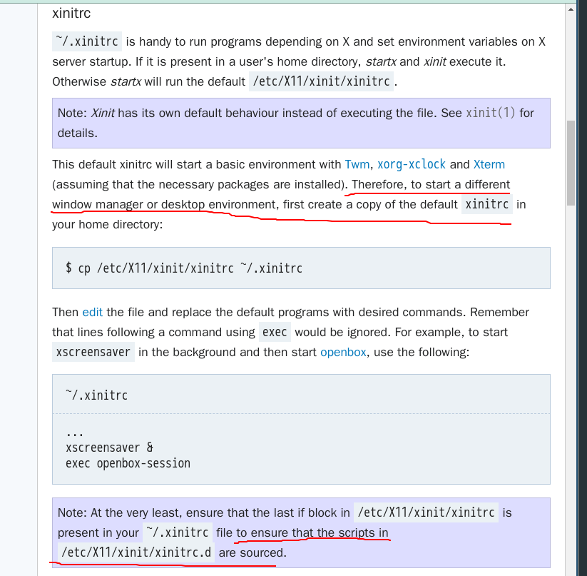 Note that in the Debian system, what many people traditionally put in the .xini‐ trc file should go in .xsession instead; this permits the same X environment to be presented whether startx, xdm, or xinit is used to start the X session. All discussion of the .xinitrc file in the xinit(1) manual page applies equally well to .xsession. Keep in mind that .xinitrc is used only by xinit(1) and completely ignored by xdm(1).